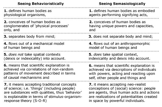 Semasiological ways of seeing movement cannot rightly be grafted onto behavioristic thinking — or vice-versa. There are too many discrepancies between them. Their aims and methods are incompatible, starting with definitions of what it is to be human: